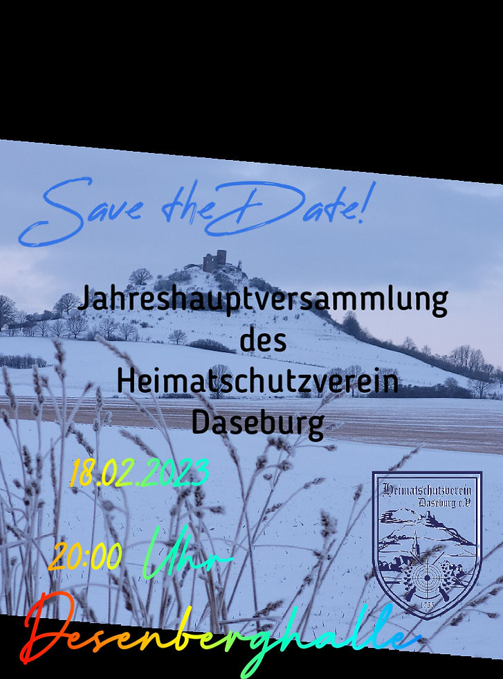 Am 18.02.2023 hält der Heimatschutzverein Daseburg seine Jahreshauptversammlung in der Desenberghalle ab. Auf der Tagesordnung stehen neben den üblichen Regularien auch die Vorstandsneuwahlen und Änderungen in der Satzung. Alle Vereinsmitglieder sind aufgerufen, an der Sitzung teilzunehmen. Interessierte Daseburger, die neu in den Verein eintreten möchten, sind ebenfalls Willkommen.